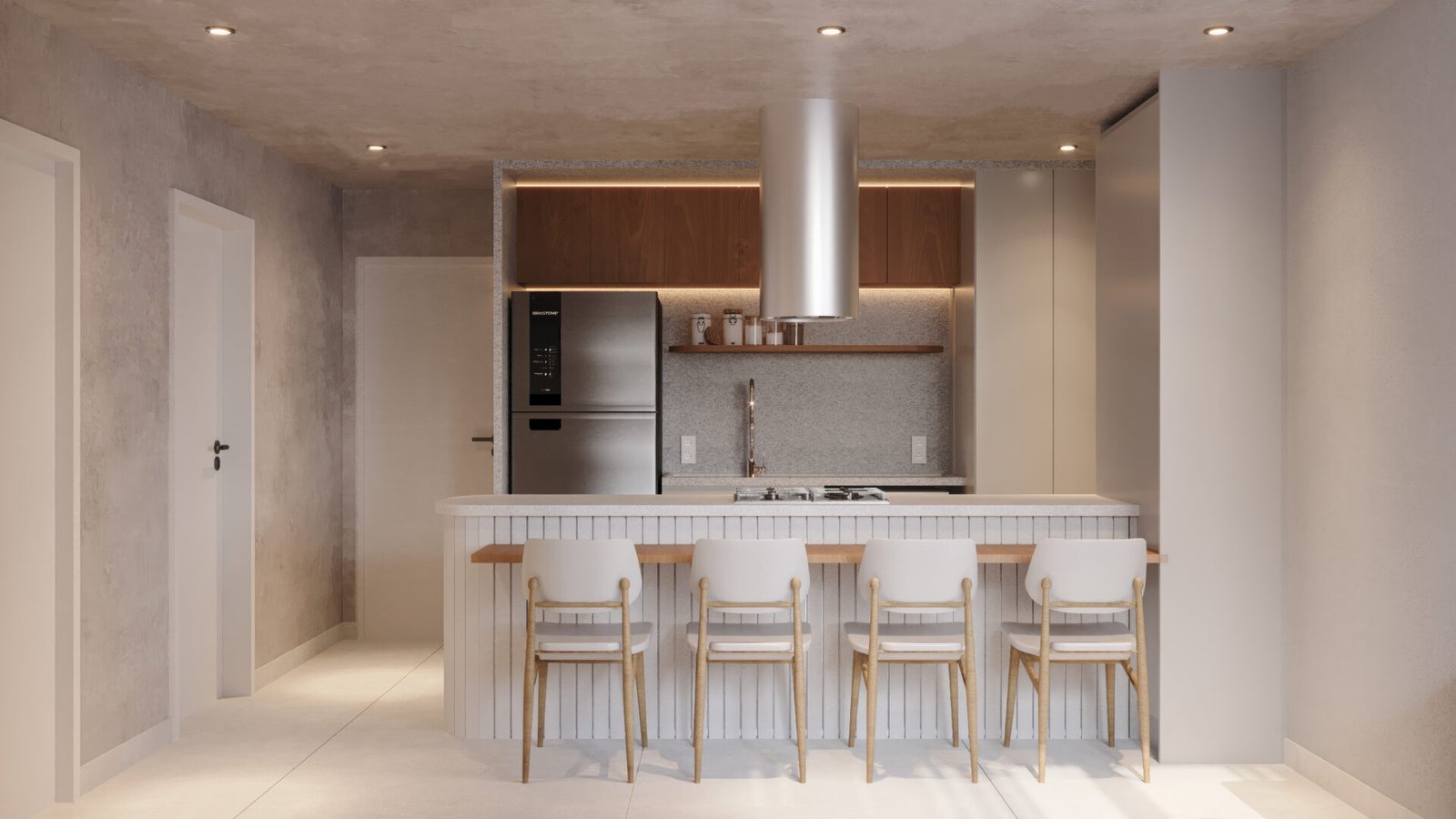 Na fachada, concreto aparente e muita luz natural. Além da localização estratégica, que deixa tudo mais perto.