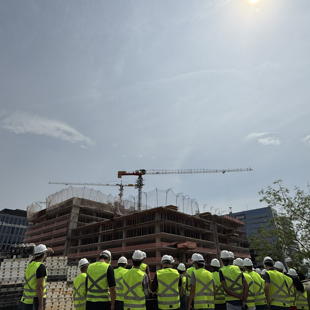 The most recent visit took place in early November, with around 30 Civil Engineering students from UDF, accompanied by Professor Nataniel Wontoon from the Concrete Structures course. Our engineer, César Leandro, led the group, presenting key technical and construction aspects of the project—such as the sequencing of concrete pours, the flying table formwork system, the assembly of welded reinforcements, and site organization, including proper waste management.